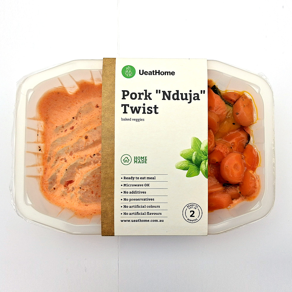 Ingredients: Pork forequarter shoulder, separable lean, bartlequed, no added fat (100g), Cream, regular thickened 35% fat, ultra high temperature treated (23g), Tomato puree, no added salt (23g), Salt cooking (0.5%), Pepper, ground, black or white (0.5g), Pumpkin, butternut, peeled, baked, no added fat (75g), Carrot, mature, baked, no added fat (75g), Sweet potato, orange flesh, peeled, backed, no added fat (50g), Nduja (C) (3g).